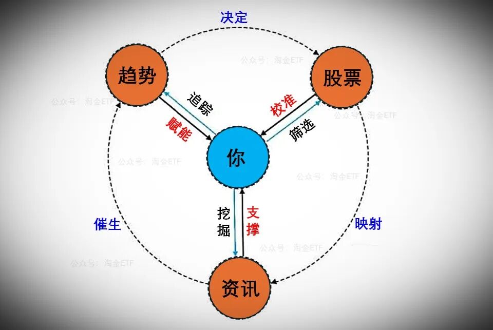 这个模型的核心,是把我们自己放在投资体系的正中心,趋势、股票、资讯围绕你形成环环相扣的循环,而三者与你的双向互动,更是决定投资成败的关键。