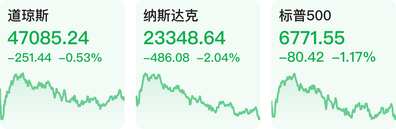 美股三大指数集体收跌,纳指跌2.04%,标普500指数跌1.17%,道指跌0.53%。大型科技股普跌,英特尔跌超6%,特斯拉跌超5%,英伟达跌超3%。热门中概股多数下跌,纳斯达克中国金龙指数跌2.05%。小马智行跌近10%,富途控股跌超7%。