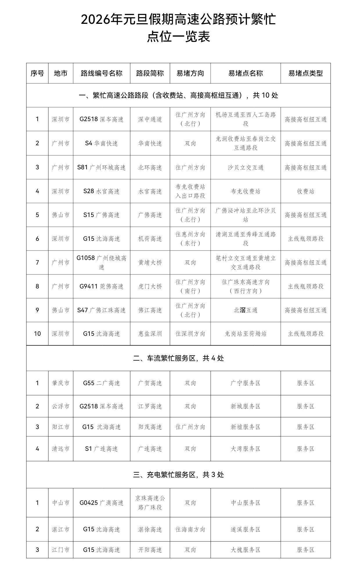 经与省公安厅交管局联合研判,2026年广东省元旦假期较为拥堵的路段、收费站、车流较饱和服务区以及充电设施利用率高的服务区。元旦假期,全省交通运输部门积极会同各方,提前研判,周密部署,合力保障公路运行安全畅通有序。